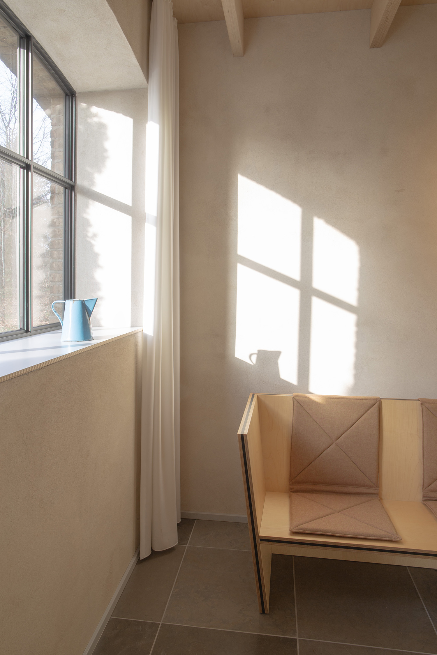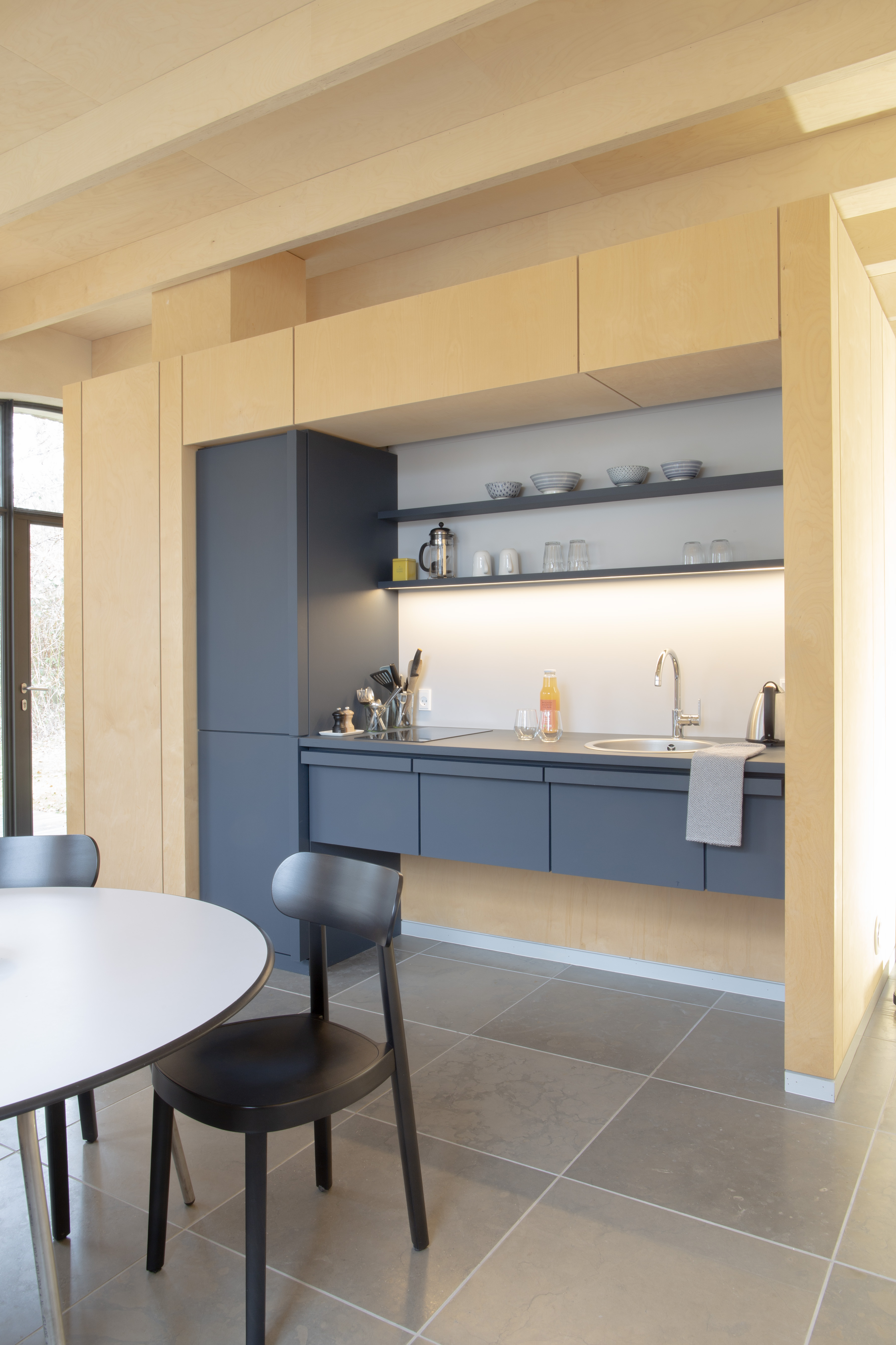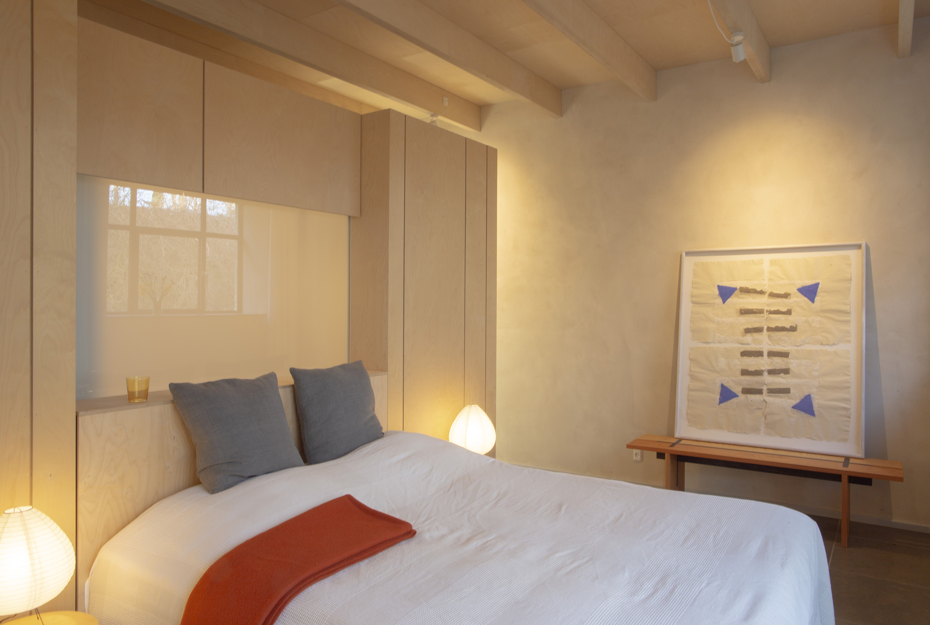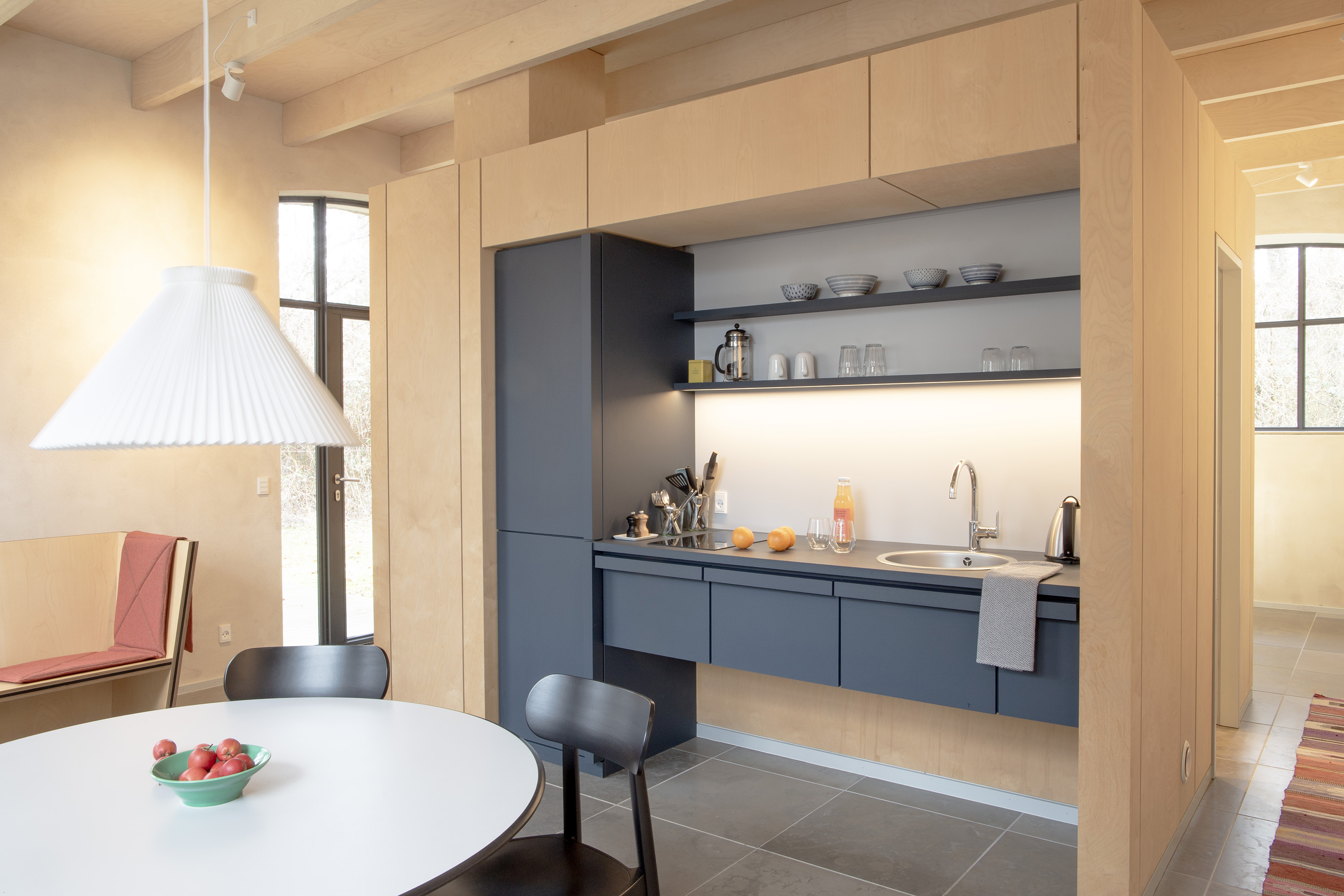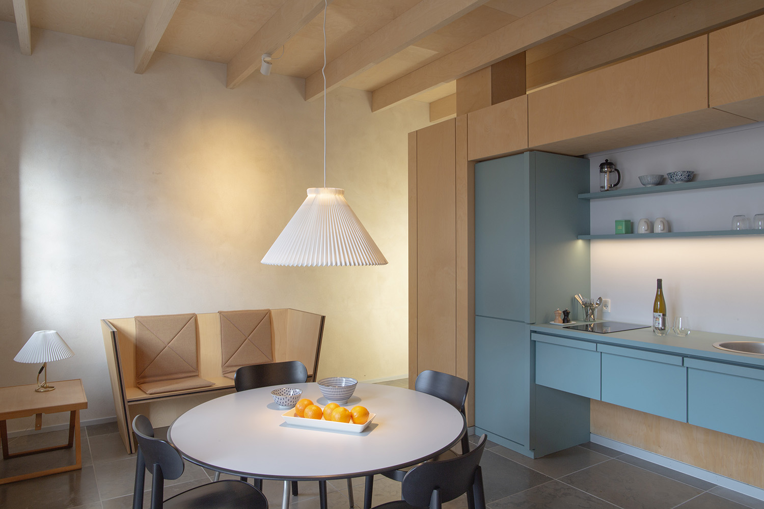 Jede der Feriewohnungen besteht aus einem einzigen 50 m2 grosszügigem Raum mit luftiger hoher Decke. In diesem befindet sich ein Kubus mit Küchenzeile auf der einen Seite zum Hof hinaus, und ein Schlafzimmer auf der anderen Seite zum Garten gelegen. Dazwischen ein geräumiges Badezimmer mit Dusche. Für 2 Personen eingerichtet.